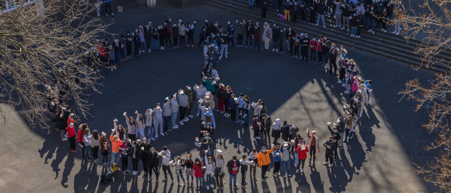 Die Schulgemeinschaft der St. Benedikt Schule steht am 03. März auf dem Schulhof zusammen und zeigt sich solidarisch mit den vom Krieg betroffenen Menschen. Der Russland-Ukraine Konflikt wurde zuvor im Unterricht thematisiert.