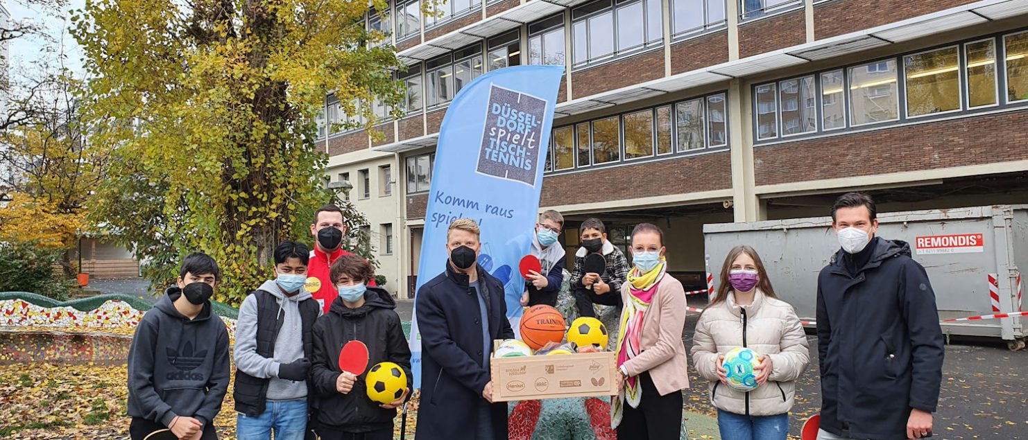 Heute war es soweit: Die erste Düsseldorfer Schule wurde mit einer Bewegungsbox bedacht, die im Rahmen der Tischtennis Outdoor-Kampagne `Düsseldorf spielt Tischtennis. Für Düsseldorf.´ durch die Teilnehmerinnen und Teilnehmer erspielt wurde. Schulleiterin Andrea Mook nahm im Beisein der Projekt-Partner Stadtwerke Düsseldorf AG und Playsports GmbH zusammen mit den fünften bis siebten Klassen der Katholische Hauptschule St. Benedikt die mit Sportmaterial gefüllte Box entgegen.